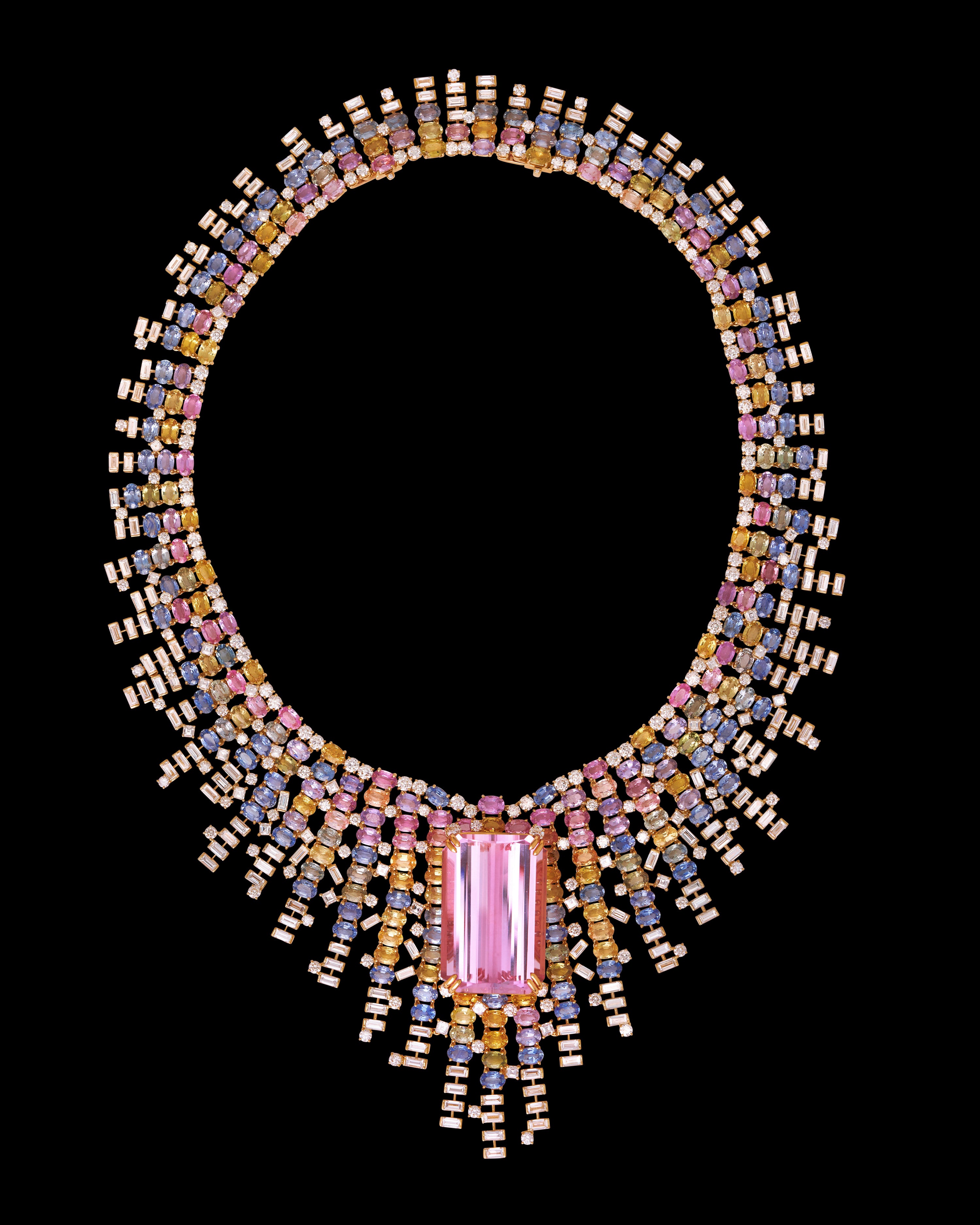 A large and very significant kunzite gemstone inspired Margot McKinney to create a ‘timeless and enduring’ collier that would showcase its extraordinary beauty. The intense colour within the hero stone – which is completely saturated throughout its structure – led her to assemble a highly ordered array of gems that complement and highlight its stunning internal hues.