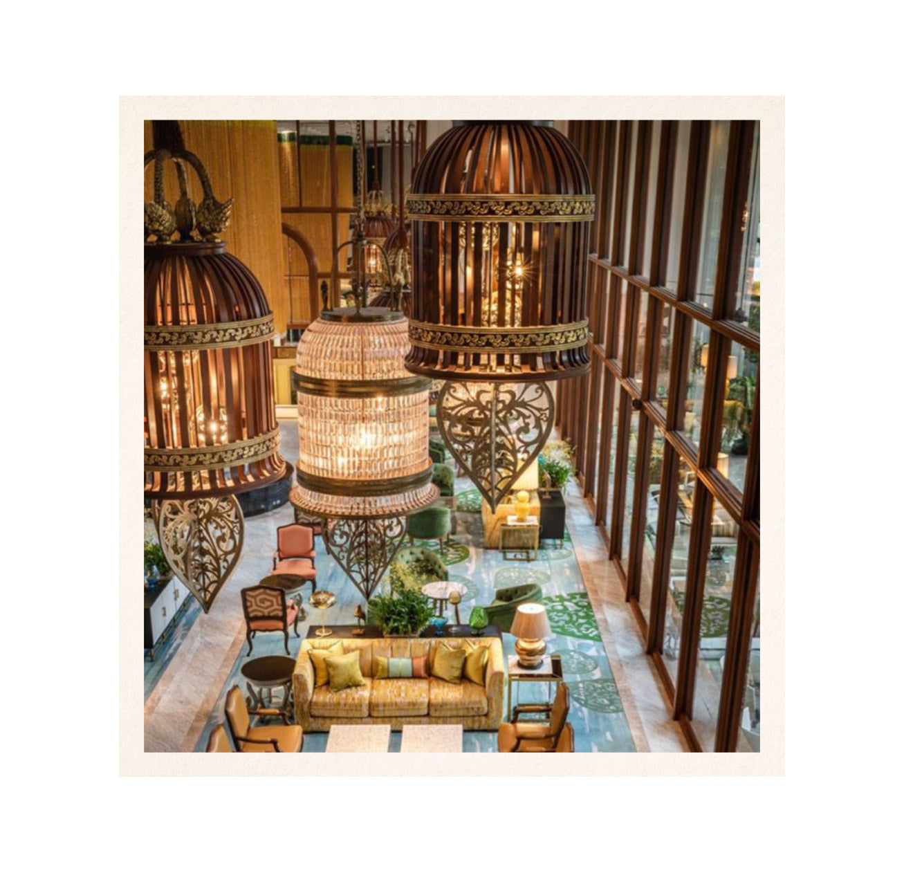 Upon entering the hotel lobby guests are greeted with a spectacular view - featuring a soaring ceiling and wide windows that create an impressive sense of openness, yet also a feeling of warmth and relaxed grandeur. An array of bell-shaped chandeliers â hanging high from the ceiling like vines in a tropical jungle â immediately draws the eye and creates an eclectic, intimate impression.Â