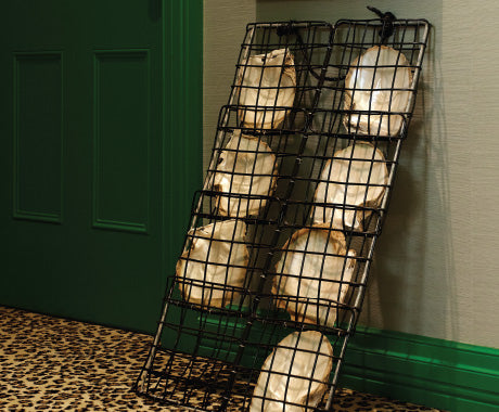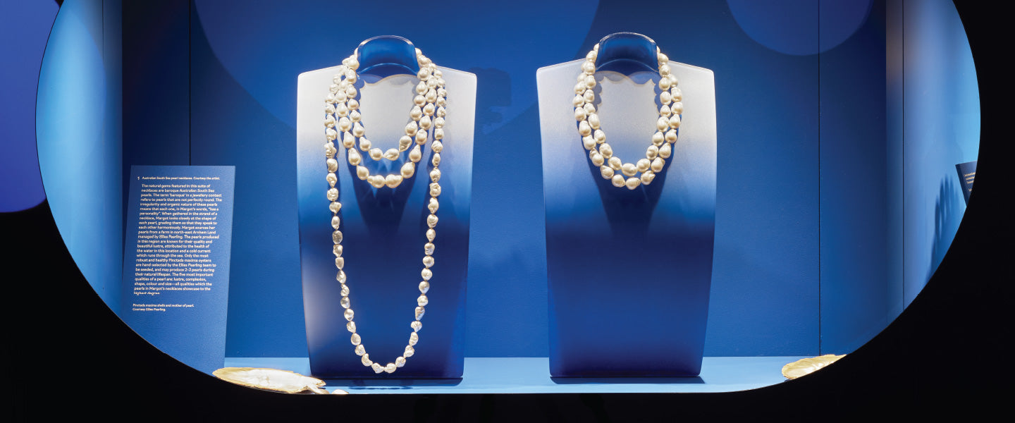 Right: An oyster cage with Pinctada maxima shells attached, displayed in Margot’s flagship store.