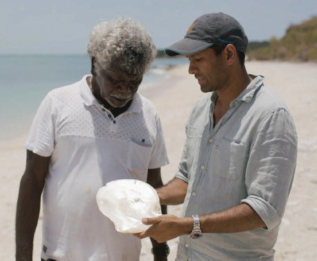 The film titled Beneath the Surface (2019) is the story of Aji Ellies’ pearl farm now based in Arnhem Land. Traditional Owner Terry Yumbulul stands on the beach, tracing the protrusion of a blister pearl on a Pinctada maxima shell, as he relates the way Aboriginal people grafted pearls onto wild shell generations ago. They pioneered a technique for culturing pearls, adapted by Ellies today.