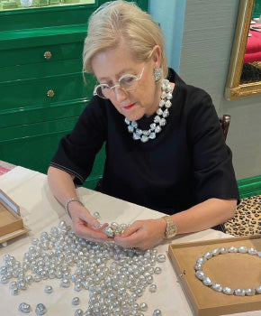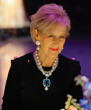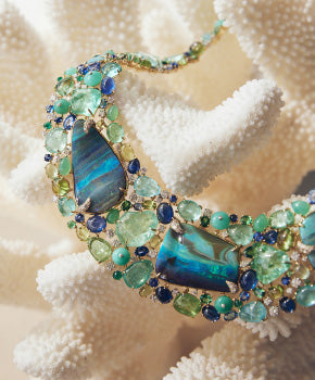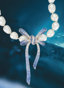 Ring featuring Australian South Sea pearl, diamonds, blue sapphires and tsavorites. Crafted in 18-karat white gold. 3.5cm x 3.5cm
